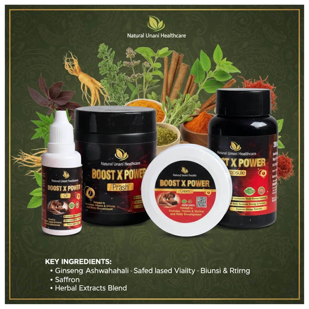 Unlock your full potential with the Boost X Power Kit, a holistic set of Ayurvedic and Unani remedies designed to enhance men’s stamina, power, and performance. This complete wellness kit targets internal health, physical endurance, and overall vitality using natural, safe, and herbal formulations.