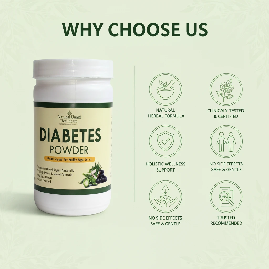 Diabetes Powder by Natural Unani Healthcare is a 100% herbal and Unani formulation crafted to help maintain healthy blood sugar levels naturally. Enriched with time-tested herbs known for their anti-diabetic and metabolic benefits, it helps regulate glucose metabolism, supports pancreatic health, and promotes overall wellness — without any side effects.