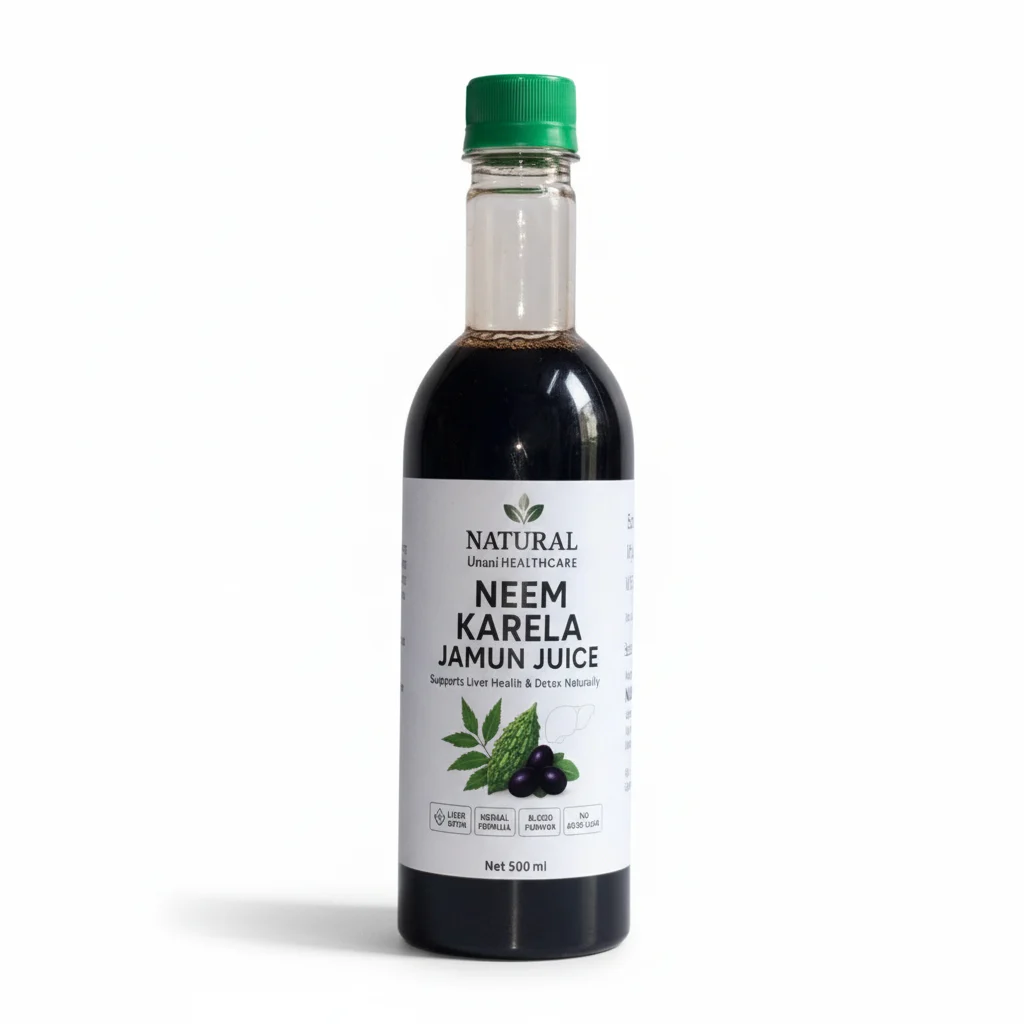 Neem Karela Jamun Juice is a powerful herbal blend formulated to promote liver health, support healthy blood sugar levels, and naturally detoxify the body. This traditional Unani formulation combines the goodness of Neem (Azadirachta indica), Karela (Bitter Gourd), and Jamun (Indian Blackberry) — three potent ingredients known for their purifying and metabolic benefits.